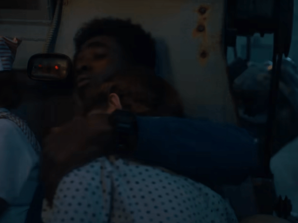 Lucas holding Max and hiding with her. (Netflix, https://www.youtube.com/watch?v=iKZyYdwS3Wg)